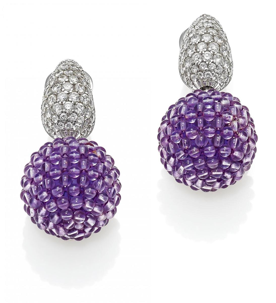750/- Weißgold, gestempelt, Gesamtgewicht: 18,6g. H.ca. 3,5cm. Ca. 138 Brillanten zus.ca. 2,5ct W(H) VVS, vielzählige Amethyst-Perlen, D.ca. 2,0mm.