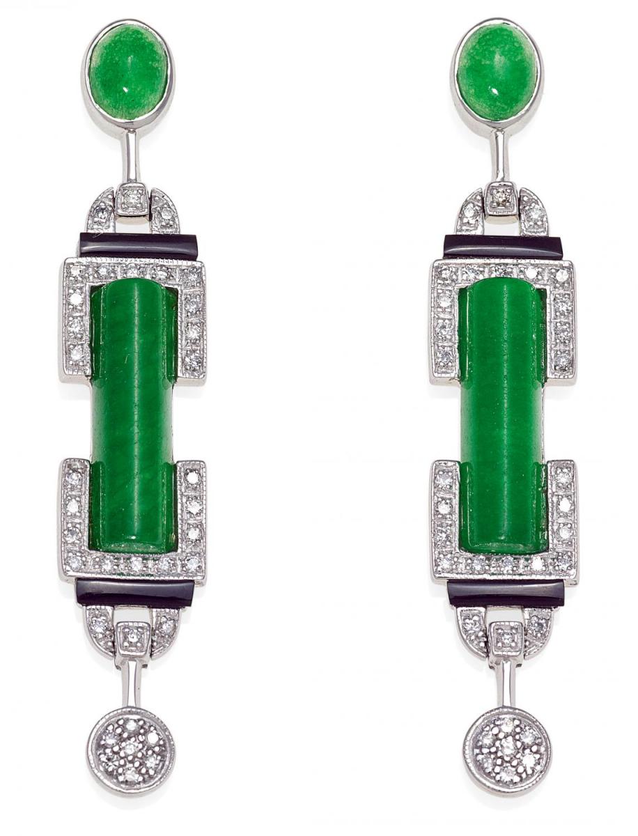 585/- Weißgold, gestempelt, Gesamtgewicht: 11,0g. H x B=ca. 5,0 x 0,9cm. 70 Brillanten zu.ca. 0,5ct, 2 ovale Achat-Cabochons zus.ca. 1,2ct, 2 fancy cut Achat-Cabochons zus.ca. 5,6ct, 4 Onyx-Stäbe.