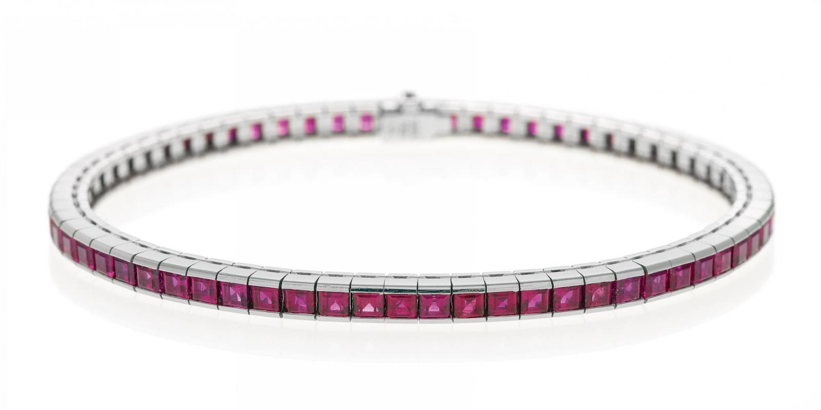 750/- Weißgold, gestempelt, Gesamtgewicht: 21,0g. L.ca. 19,5cm. 66 facettierte Rubin-Karrees zus.ca. 7,2ct, feine Farbe.