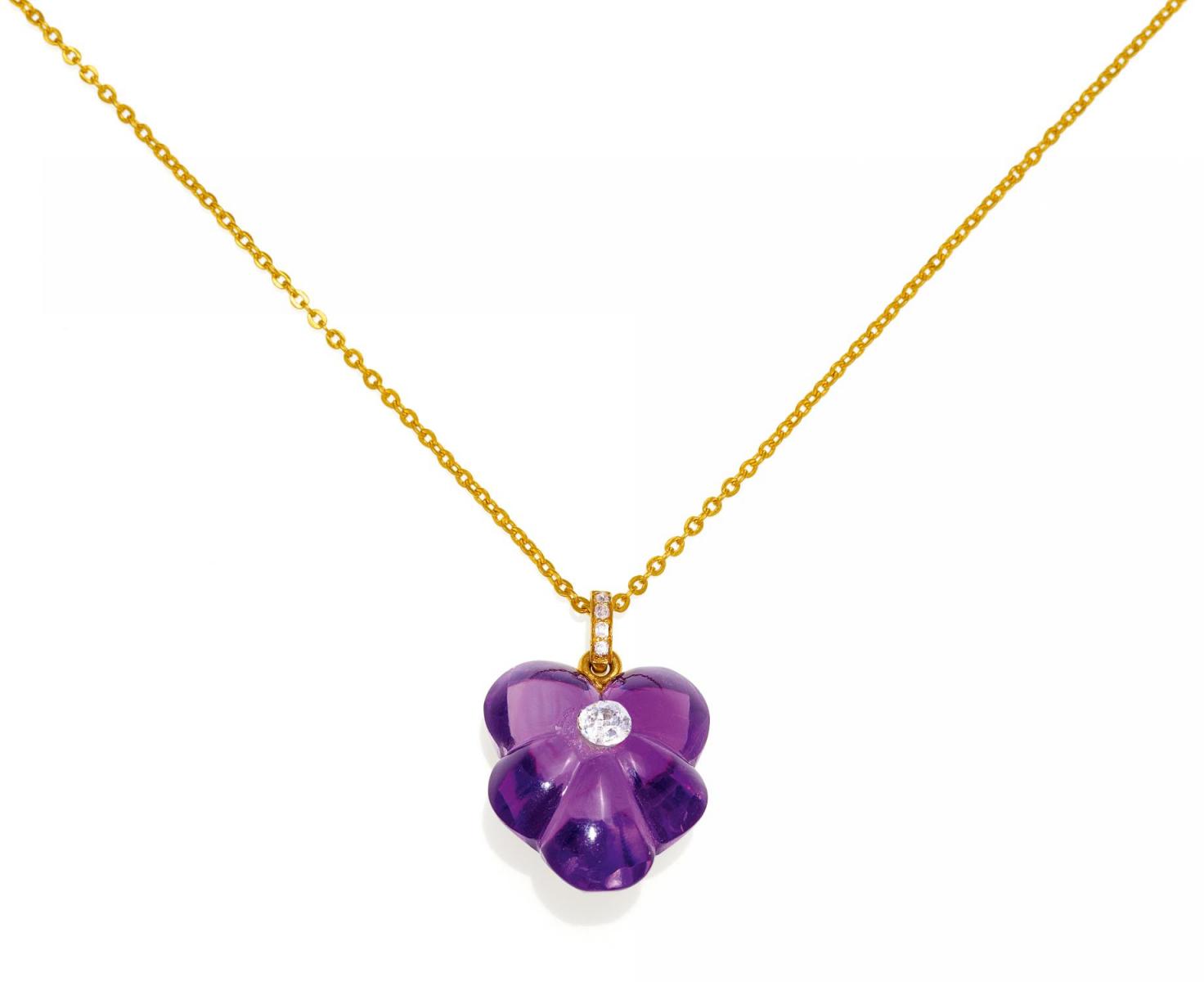 750/- Gelbgold, Gesamtgewicht: 11,9g. L.ca. 49,5cm. 1 Altschliff-Diamant ca. 0,3ct Cr(J) P1, 4 Diamantrosen, 1 handgravierter Amethyst D.ca. 19,0 x 16,2mm.