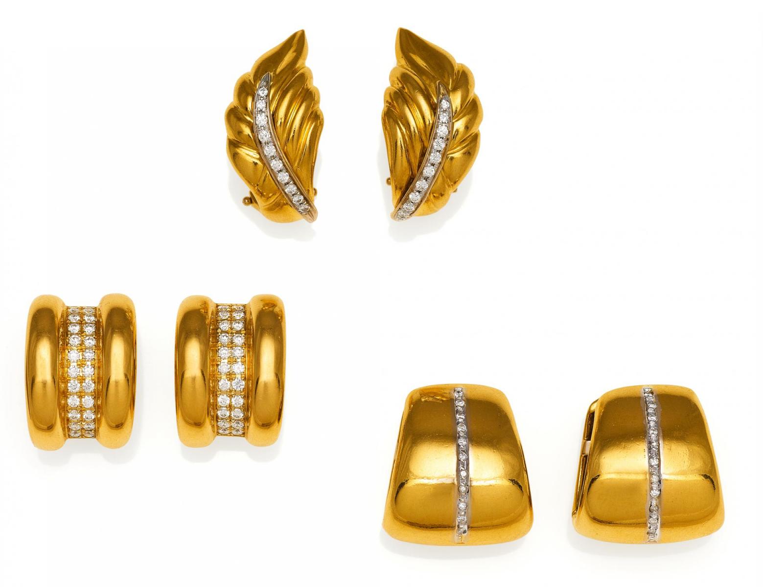 750/- Gelb-/Weißgold, gestempelt, Gesamtgewicht: 48,5g. H x B=ca. 2,5 x 1,2cm; 2,0 x 1,9cm; 2,2 x 1,4cm. 68 Brillanten zus.ca. 1,4ct.