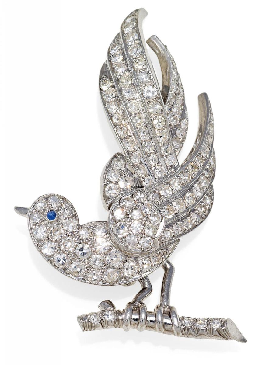 900/- Platin, Gesamtgewicht: 8,5g. H x B=ca. 4,5 x 2,9cm. 111 Diamanten im 8/8-Schliff zus.ca. 3,3ct, 1 winziger Saphir-Cabochon.