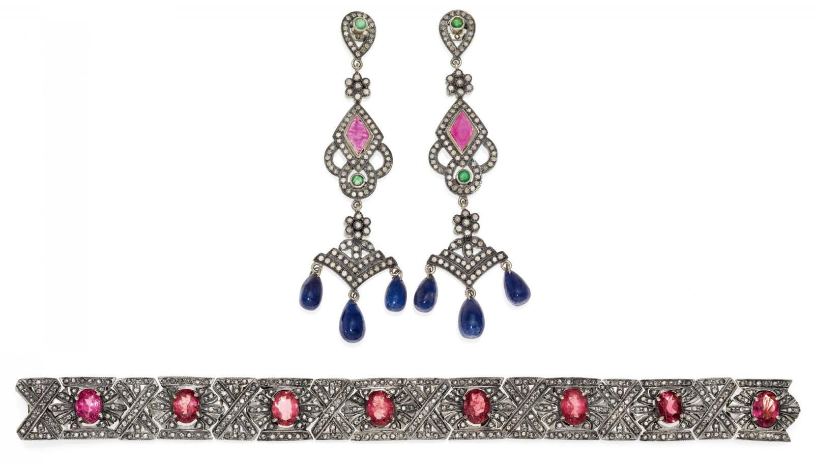 925/- Silber, teils vergoldet, Gesamtgewicht: 48,0g. Armband L.ca. 17,8cm, Ohrgehänge H.ca. 8,8cm. Ca. 502 Diamantrosen zus.ca. 1,0ct, 6 Saphir-Tropfen, 2 facettierte Rubin-Trapeze, 2 rund facettierte Smaragde, 8 oval facettierte Rubine zus.ca. 15,4ct.