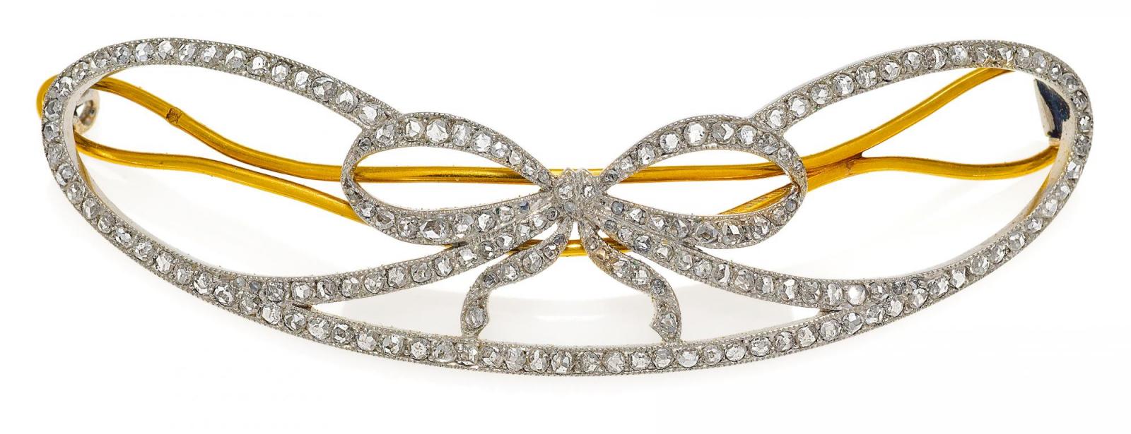 750/- Gelbgold, Platinverbödung, Punzen, Gesamtgewicht: 9,5g. D.ca. 6,5 x 1,4cm. Ca. 167 Diamantrosen zus.ca. 1,2ct.