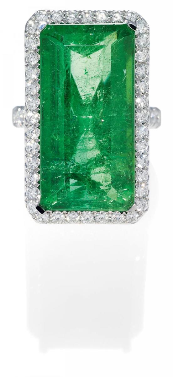 750/- Weißgold, gestempelt, Gesamtgewicht: 15,5g. EU-RM: 53,5. Ringtop D.ca. 2,8 x 1,7cm. 51 Brillanten zus.ca. 1,5ct, 1 facettierter Turmalin im Treppenschliff ca. 20,8ct.