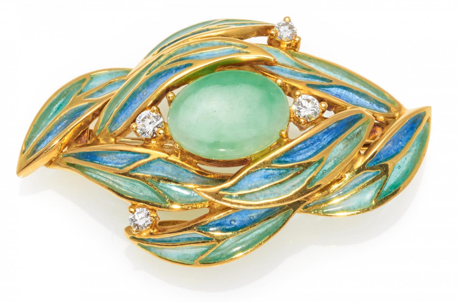750/- Gelbgold, transluzides Fensteremail, Gesamtgewicht: 9,9g. H x B=ca. 2,3 x 3,8cm. 4 Brillanten zus.ca. 0,1ct, 1 ovaler Jadeit-Cabochon D.ca. 11,1x8,3x2,6mm.