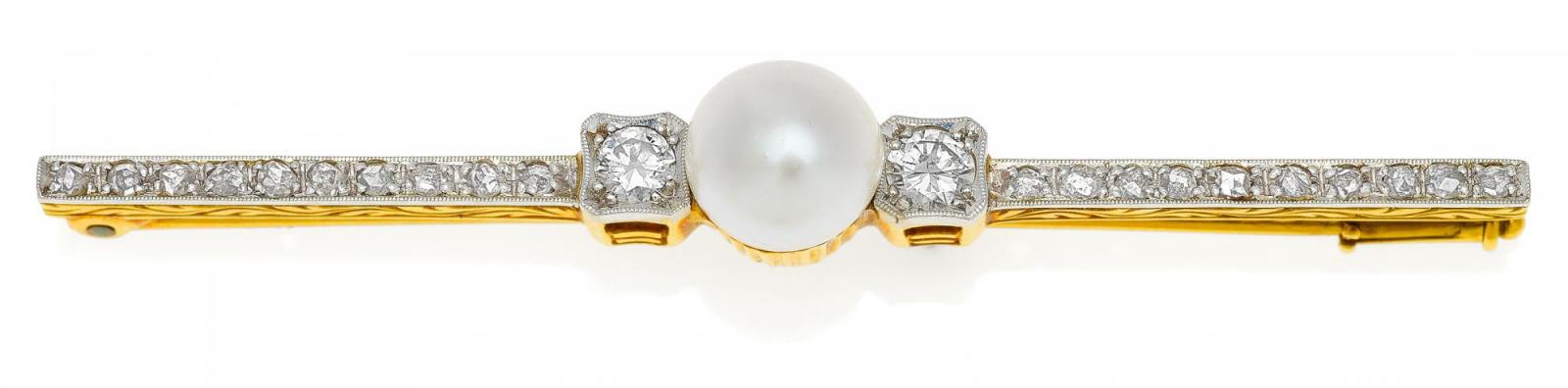 585/- Gelbgold, Platinverbödung, Gesamtgewicht: 5,5g. L.ca. 6,0cm. 22 Diamanten im Alt- und Rosenschliff zus.ca. 0,5ct, 1 Naturperl-Button, angebohrt, D.ca. 7,8 - 8,0mm, grau-weiß.