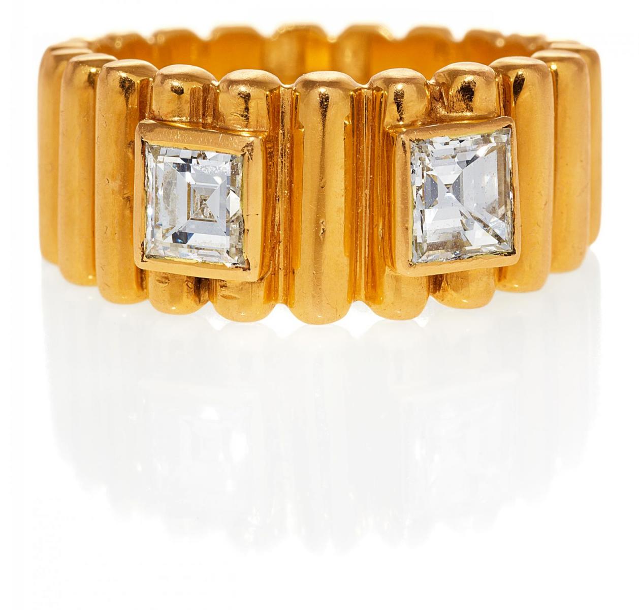 750/- Gelbgold, gestempelt, Gesamtgewicht: 8,5g. EU-RM: 53. 2 Diamant-Karrees zus.ca. 1,0ct TW-W(G-H) VVS1-2.