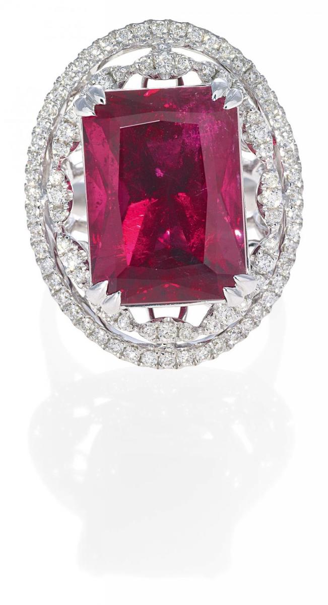 750/- Weißgold, gestempelt, Gesamtgewicht: 15,8g. EU-RM: 55,5. Ca. 122 Brillanten zus.ca. 0,6ct, 1 facettierter Turmalin im Stern-/Treppenschliff ca. 15,3ct.