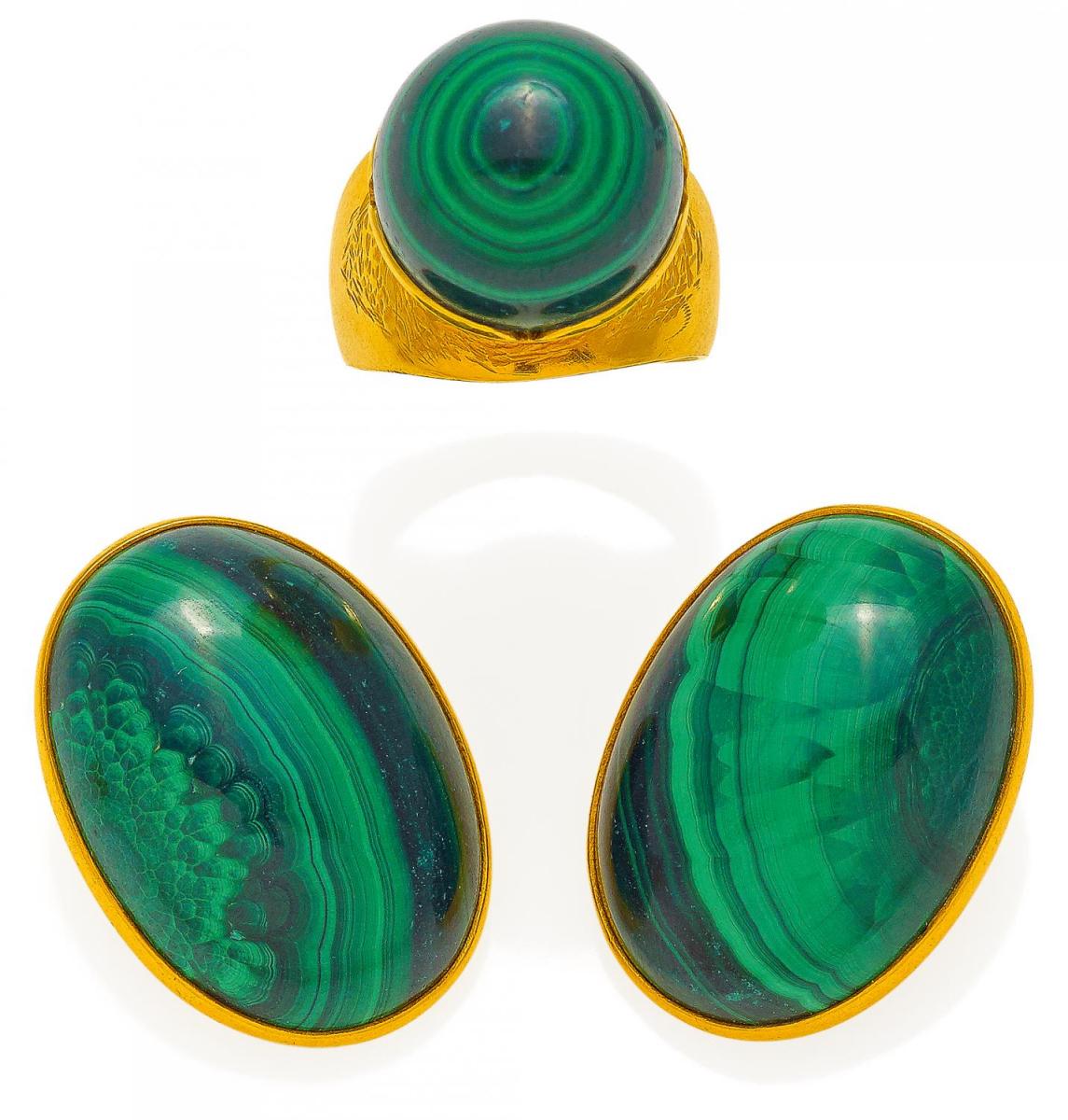 Edelsteine: 1 Malachit-Kugel D.ca. 13,8mm, 2 ovale Malachit-Scheiben D.ca. 24,7 x 17,8mm..