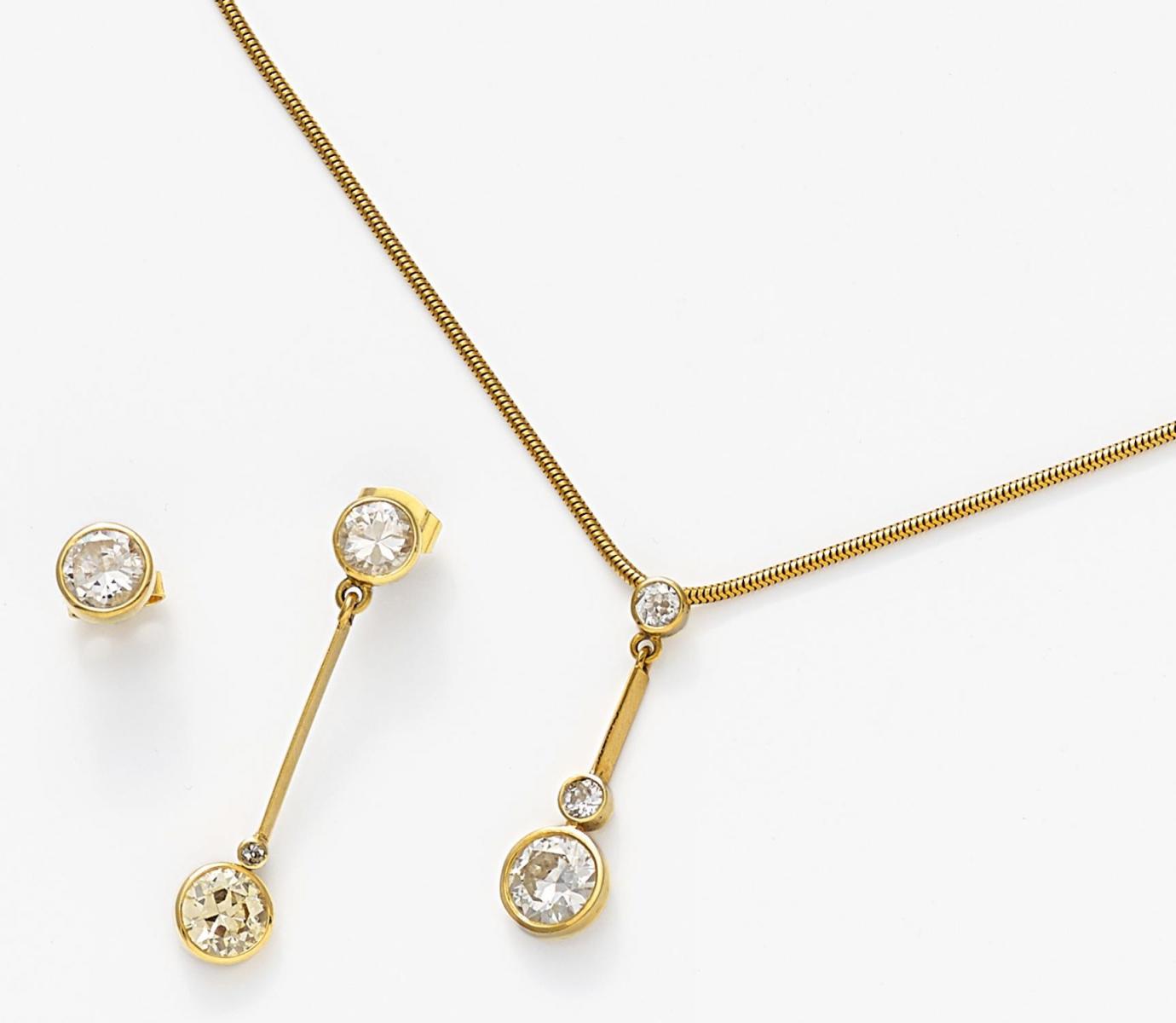 DIAMANT-KONVOLUT: ANHÄNGERKETTE, ZWEI EINZELNE OHRSTECKER/OHRHÄNGER.