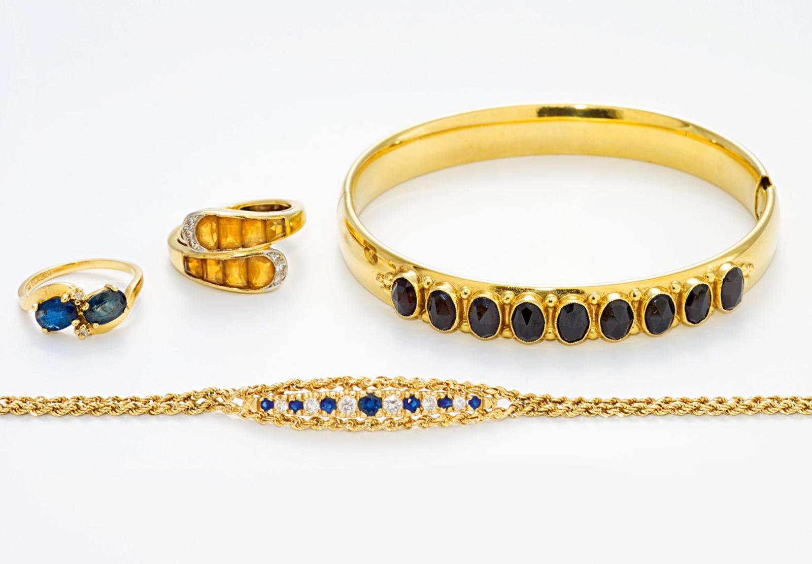 DIAMANT-FARBSTEIN-KONVOLUT: ZWEI RINGE, EINE ARMSPANGE, EIN ARMBAND.