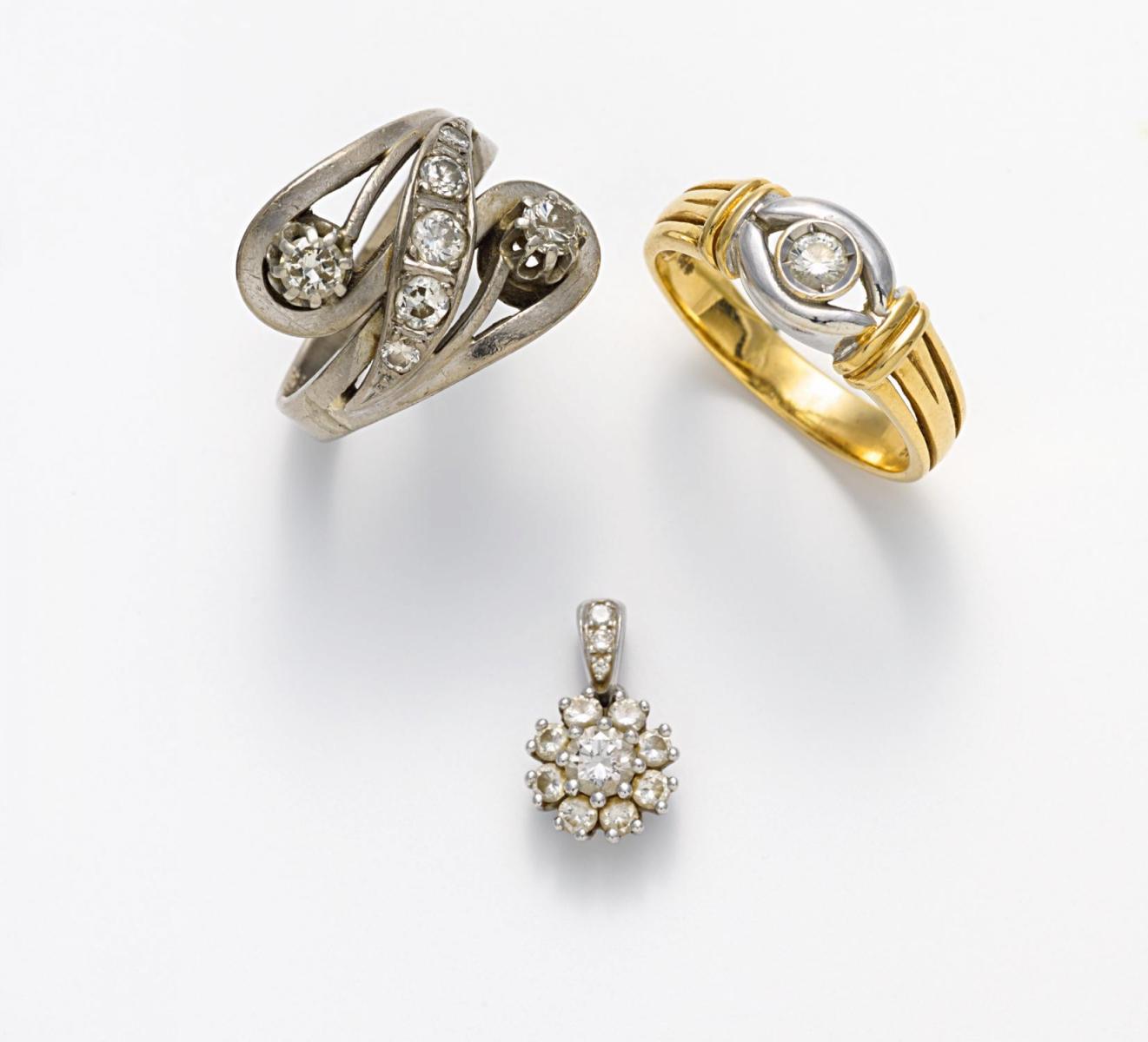 DIAMANT-KONVOLUT: ZWEI RINGE UND EIN ANHÄNGER.