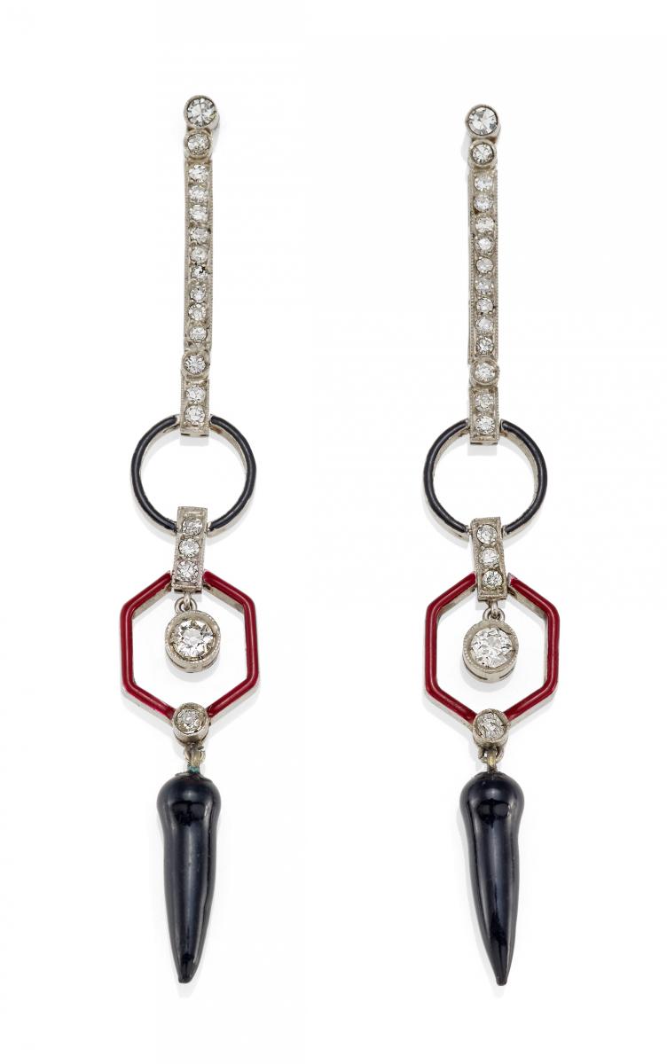 900/- Platin, farbiges Email, Gesamtgewicht: 10,5g. L.ca. 7,6cm. 38 Diamanten im Alt- und 8/8-Schliff zus.ca. 0,7ct.