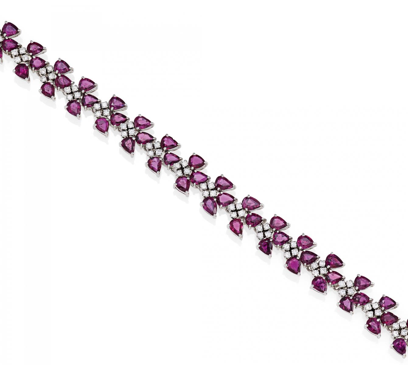 585/- Weißgold, Gesamtgewicht: 27,1g. L.ca. 17,5cm. 80 Brillanten zus.ca. 0,3ct, 60 facettierte Rubin-Tropfen zus.ca. 13,8ct.