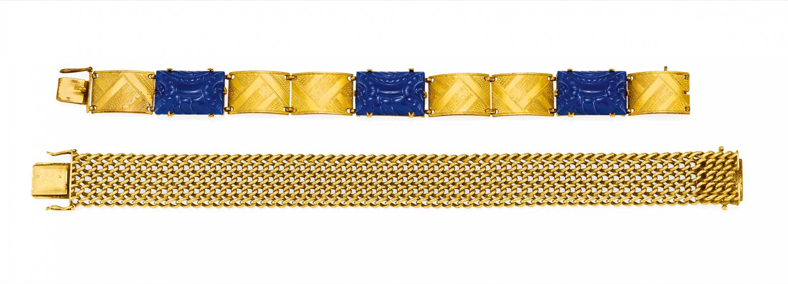 Beilage: Modeschmuck-Armband mit blauer Einlage, Messing.