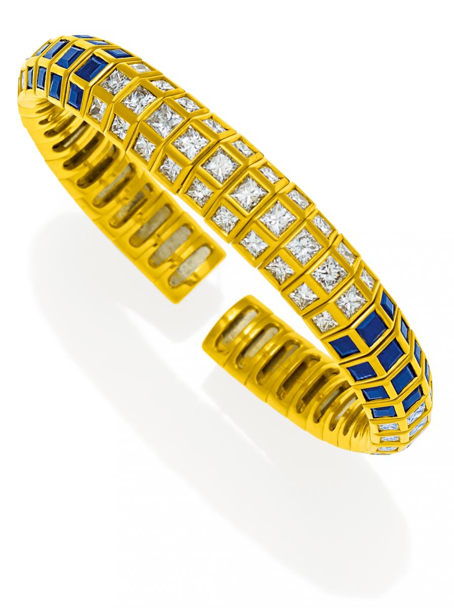 750/- Gelbgold, Stahl, Gesamtgewicht: 51,3g. Innendurchmesser ca. 4,4 x 4,5cm. 54 Diamant-Karrees zus.ca. 3,7ct W(H) VVS-VS, 24 facettierte Saphir-Karrees zus.ca. 0,9ct.