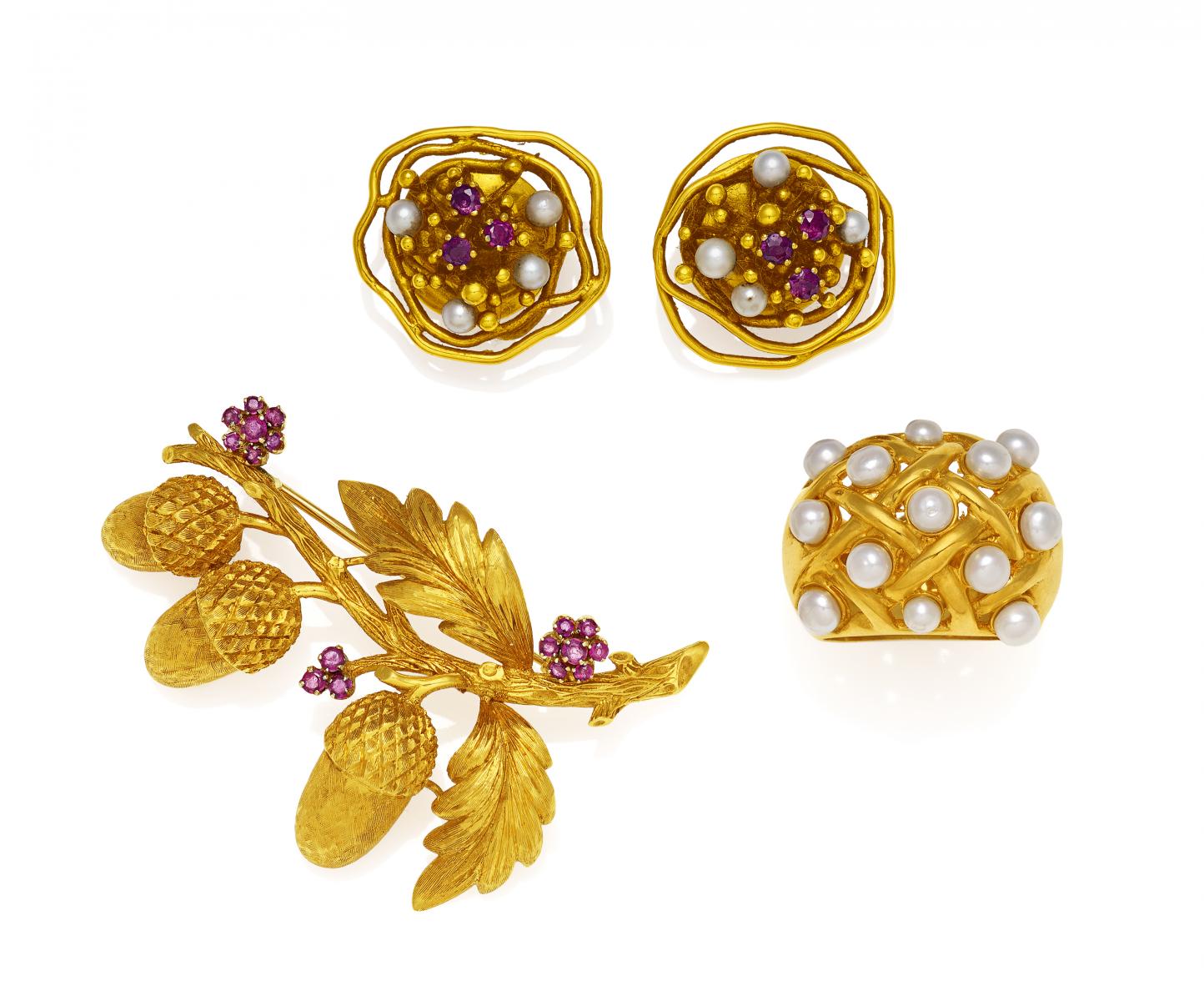 585/- Gelbgold, Gesamtgewicht: 39,3g. EU-RM: 52,5. 23 rund facettierte Rubine, 21 Süßwasser-Zuchtperlen, D.ca. 3,2mm, rund, weiß-rosé.
