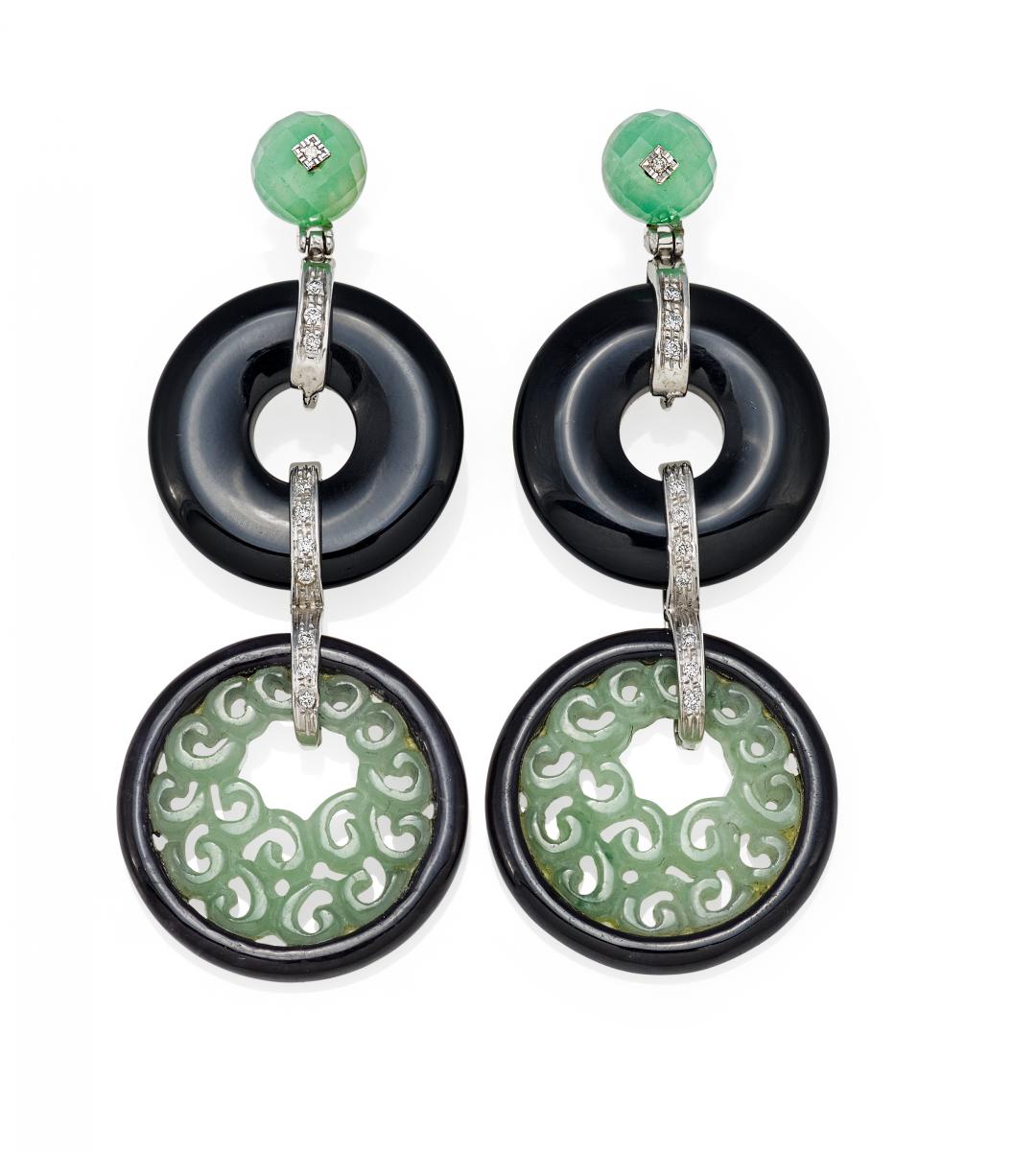 750/- Weißgold, Gesamtgewicht: 17,1g. H.ca. 6,2cm. Diamanten zus.ca. 0,1ct, 4 Onyx-Elemente, 2 handgravierte Nephrit-Elemente, 2 facettierte Nephrit.