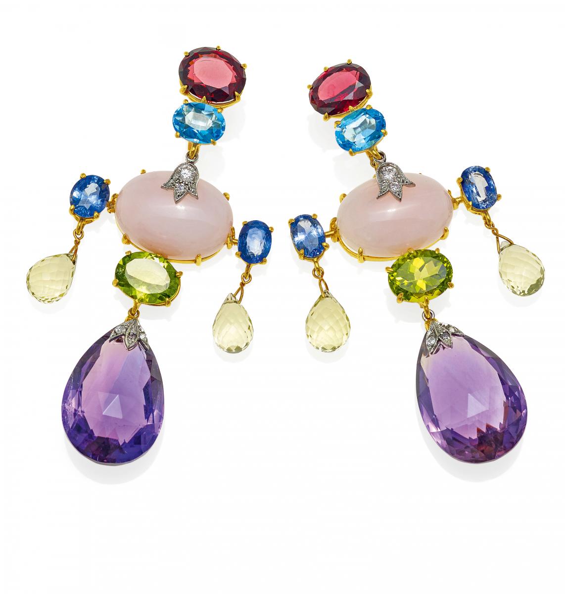 750/- Gelbgold, 950/- Platin, Gesamtgewicht: 26,5g. L.ca. 6,5cm. 10 Diamanten im Brillant-/Rosen- und 8/8-Schliff zus.ca. 0,2ct, 2 oval facettierte Turmaline D.ca. 8,1x10,3mm, 2 oval facettierte Topase D.ca. 5,7x8,0mm, 4 oval facettierte Saphire D.ca. 7,0 x 4,8mm, 2 oval facettierte Peridots D.ca. 7,8x9,9mm, 2 facettierte Citrin- Pampeln D.ca. 10,0x6,6mm, 2 facettierte Amethyst-Tropfen D.ca. 23,4x15,4mm, 2 ovale rosafarbene Opal-Cabochons D.ca. 12,6x17,6mm.