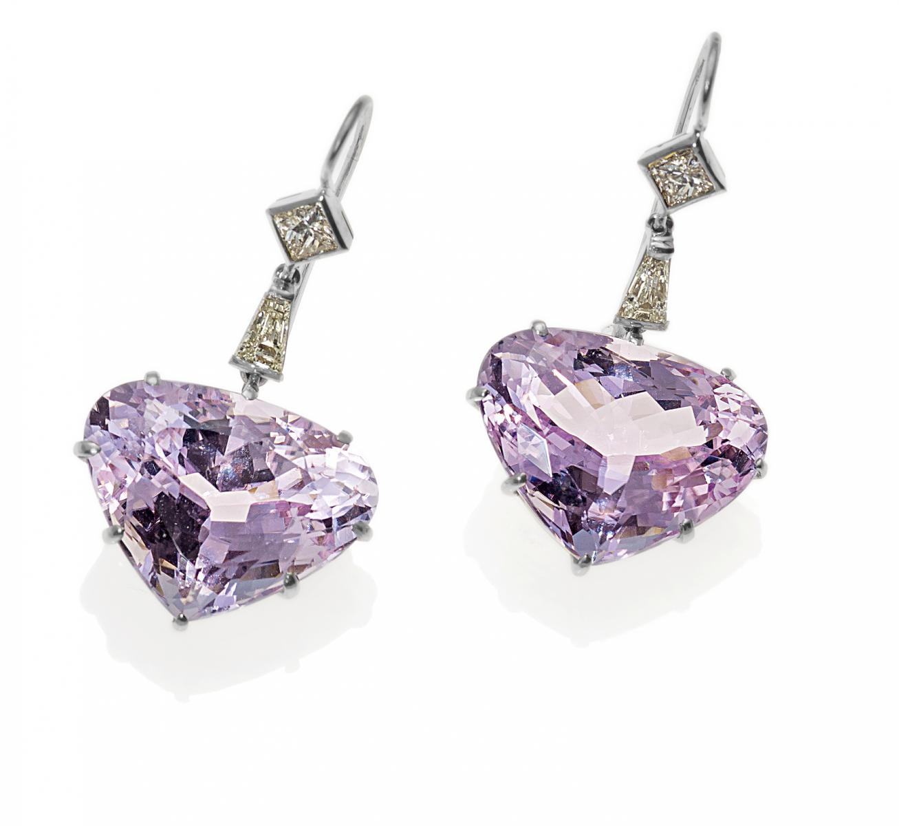 750/- Weißgold, Gesamtgewicht: 13,0g. H x B=ca. 4,0 x 2,1cm. 4 Diamanten im Trapez- und Prinzess-Schliff zus.ca. 0,7ct, 2 facettierte Kunzit-Herzen H x B=ca. 15,8 x 21,1mm.