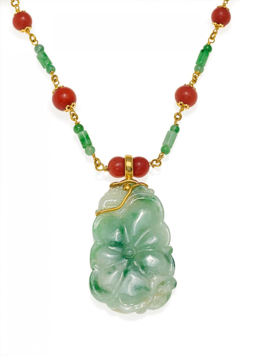 750/- Gelbgold, Gesamtgewicht: 41,5g. L.ca. 49,5cm. 18 Korall-Kugeln (Mittelmeer), rund, D.ca. 8,5-7,0mm. 24 Jadeit-Kugeln und 12 Jadeit-Stäbchen, 1 graviertes Jadeit-Element D.ca. 4,6x2,6x0,5mm.