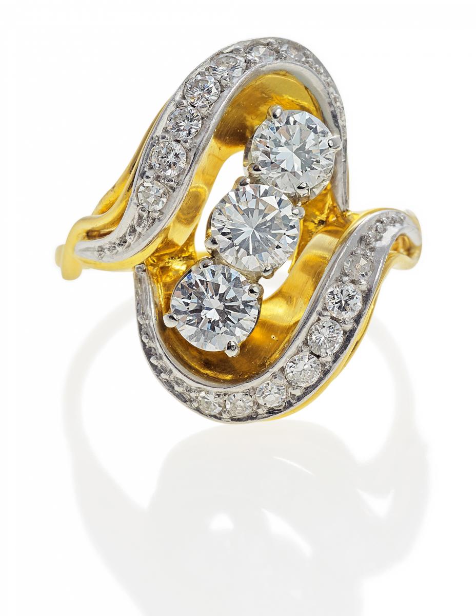 750/- Gelb-/Weißgold, Gesamtgewicht: 8,0. EU-RM: 58. 17 Diamanten im 8/8-/ Alt- und Brillantschliff zus.ca. 1,2ct TW(F-G) VVS-SI2.