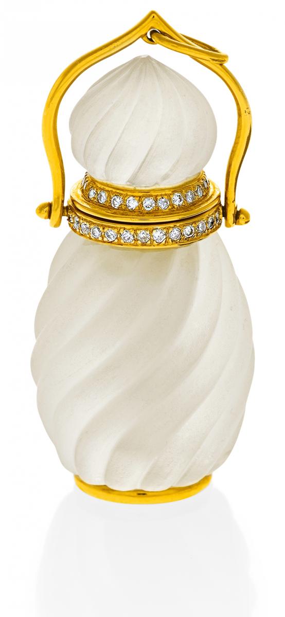 750/- Gelbgold, Gesamtgewicht: 22,9g. H.ca. 4,8cm. 50 Brillanten zus.ca. 0,3ct, handgravierter Bergkristall, innenliegend zwei winzige Saphir-Cabochons.