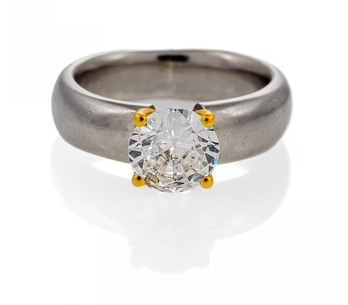 750/- Weiß-/Gelbgold, Gesamtgewicht: 10,6g. EU-RM: 52,5. 1 Diamant im Übergangsschliff ca. 1,4ct W(H) VVS2.