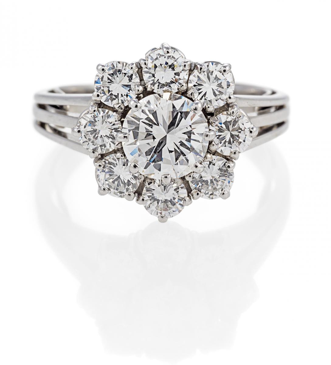 750/- Weißgold, Gesamtgewicht: 7,0g. EU-RM: 55. 9 Brillanten zus.ca. 2,0ct TW-W(F-H) VVS1-2.