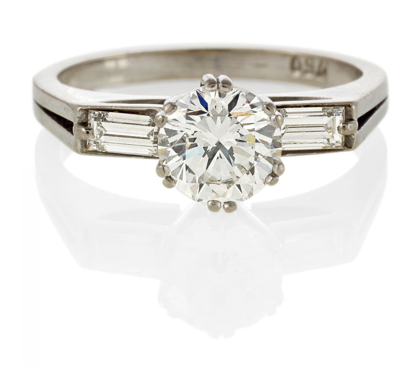 750/- Weißgold, Gesamtgewicht: 4,5g. EU-RM: 53. 1 Brillant ca. 1,0ct W(H) VVS2, 2 Diamant-Baguettes zus.ca. 0,2ct.