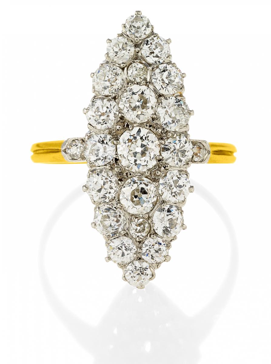 750/- Gelbgold, Silber, Gesamtgewicht: 5,2g. EU-RM: 54,5. 23 Altschliff-Diamanten zus.ca. 1,2ct W-TCr(H-I) VS-SI2.
