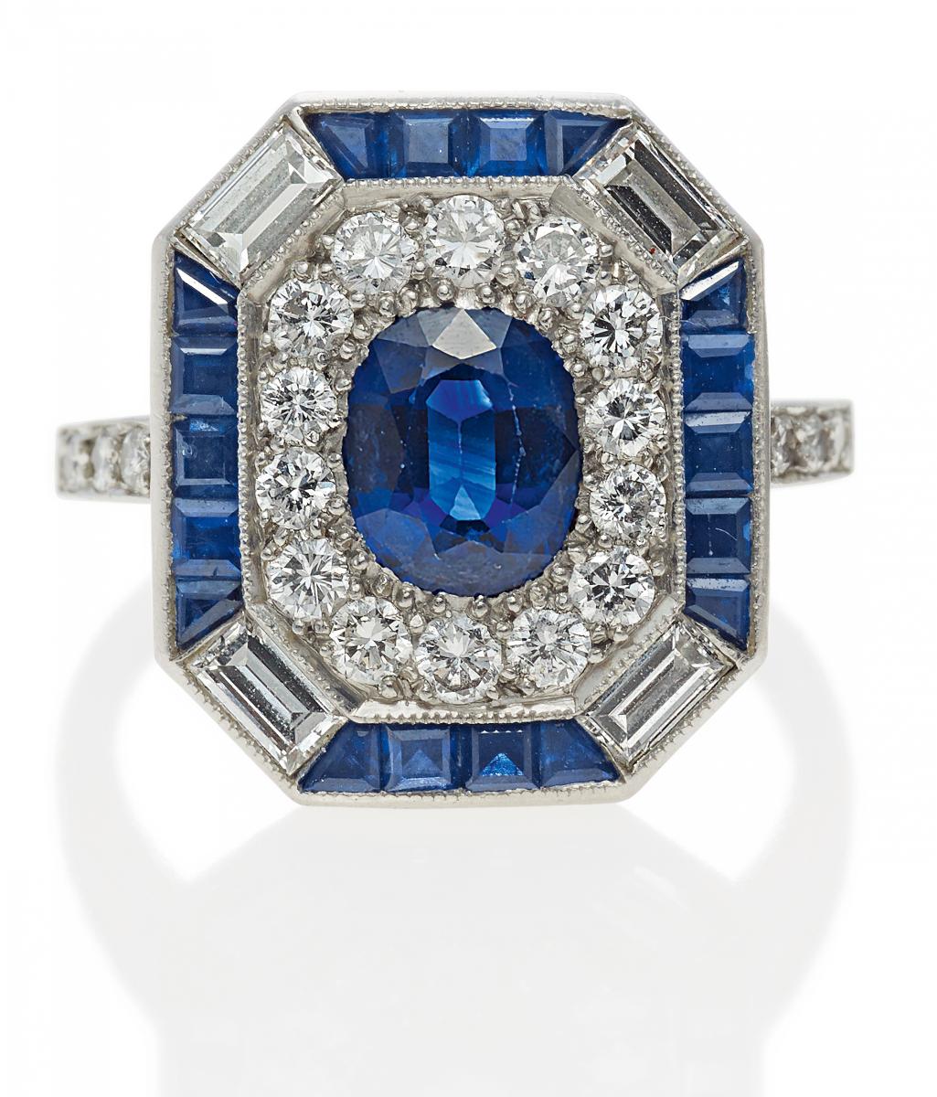 900/- Platin, Gesamtgewicht: 6,7g. EU-RM: 49. 24 Diamanten im Baguette- und Brillantschliff zus.ca. 0,5ct, 1 oval facettierter Saphir ca. 1,1ct, Burma unbehandelt. 18 facettierte Saphir-Karrees.