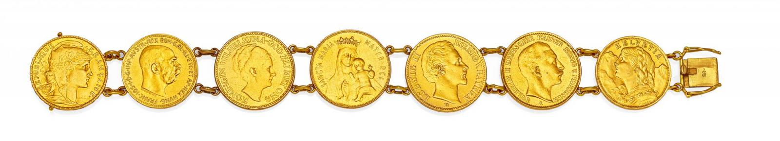 Beschreibung: 7 verschiedene Goldmünzen: 20 Francs, 20 Mark (1910), 20 Mark (1873),10 Gulden (1925), 20 Kronen (1915), 20 Schweizer Franken.