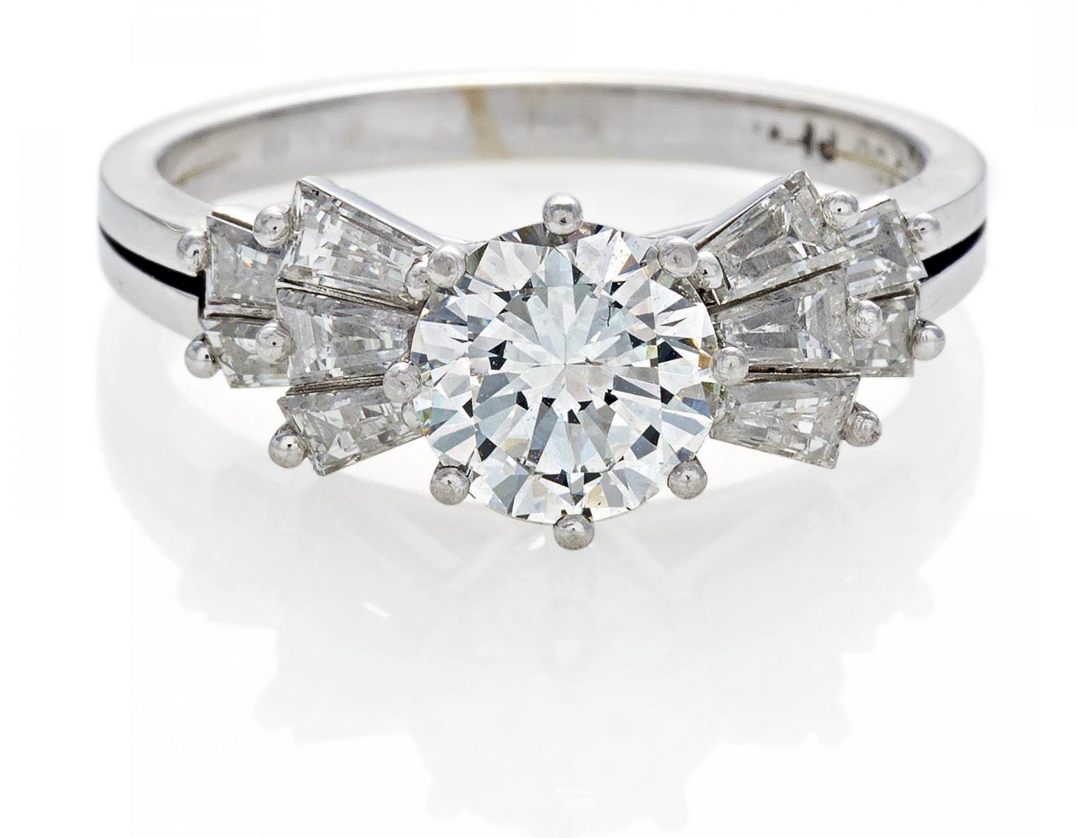 Diamanten: 1 Brillant ca. 0,9ct W(H) VS2, 10 Diamant-Trapeze zus.ca. 0,1ct..