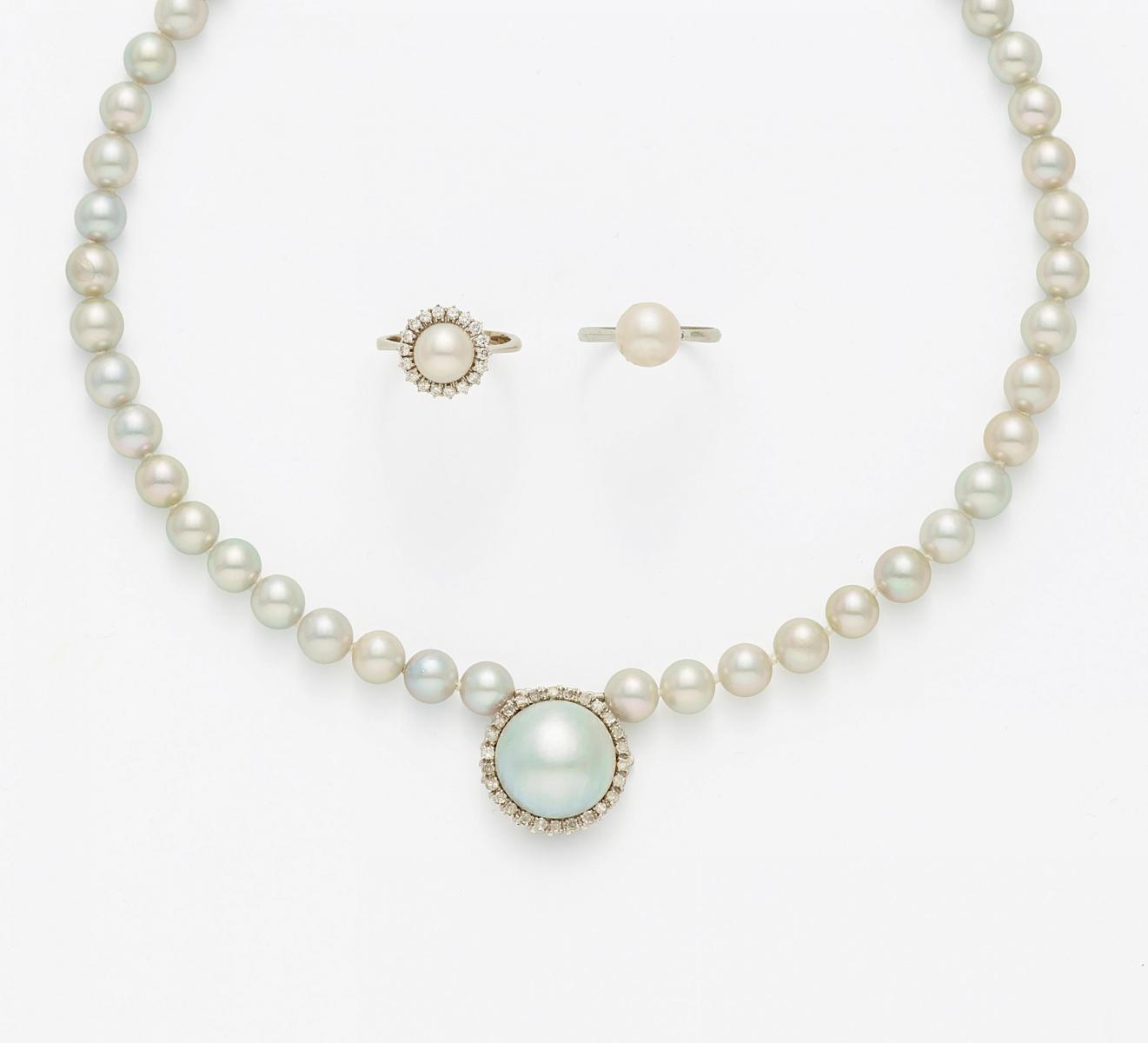 Org. Substanzen: 1 Mabé-Zuchtperle, D.ca. 16,5mm, vielzählige Akoya-Zuchtperlen, rund, D.ca. 7,9mm, grau. 2 Akoya-Zuchtperlen,rund, D.ca. 8,2mm, 8,9mm, weiß-leicht rosé.