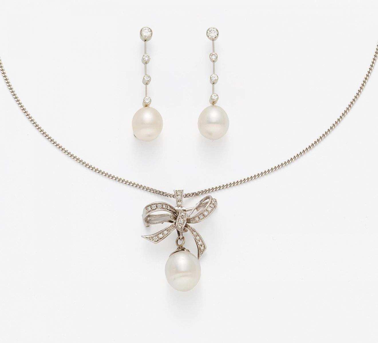 PERL-DIAMANT-SET: ANHÄNGERKETTE UND OHRGEHÄNGE.