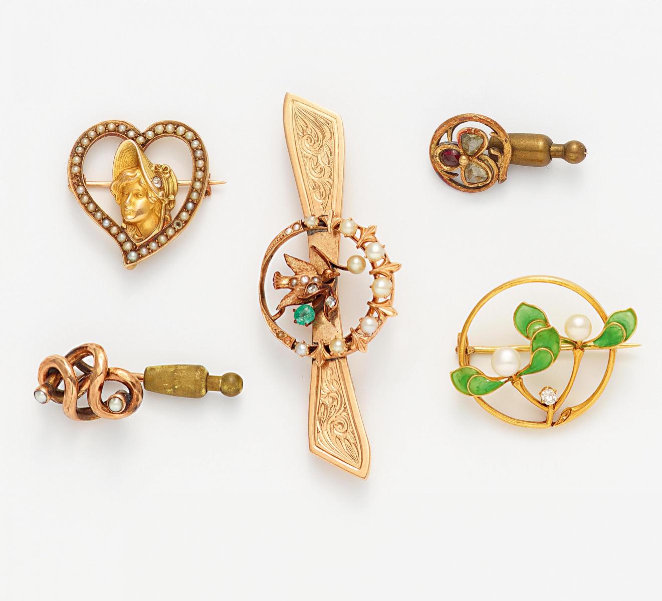 KONVOLUT: FÜNF BROSCHEN/ NADELN.
