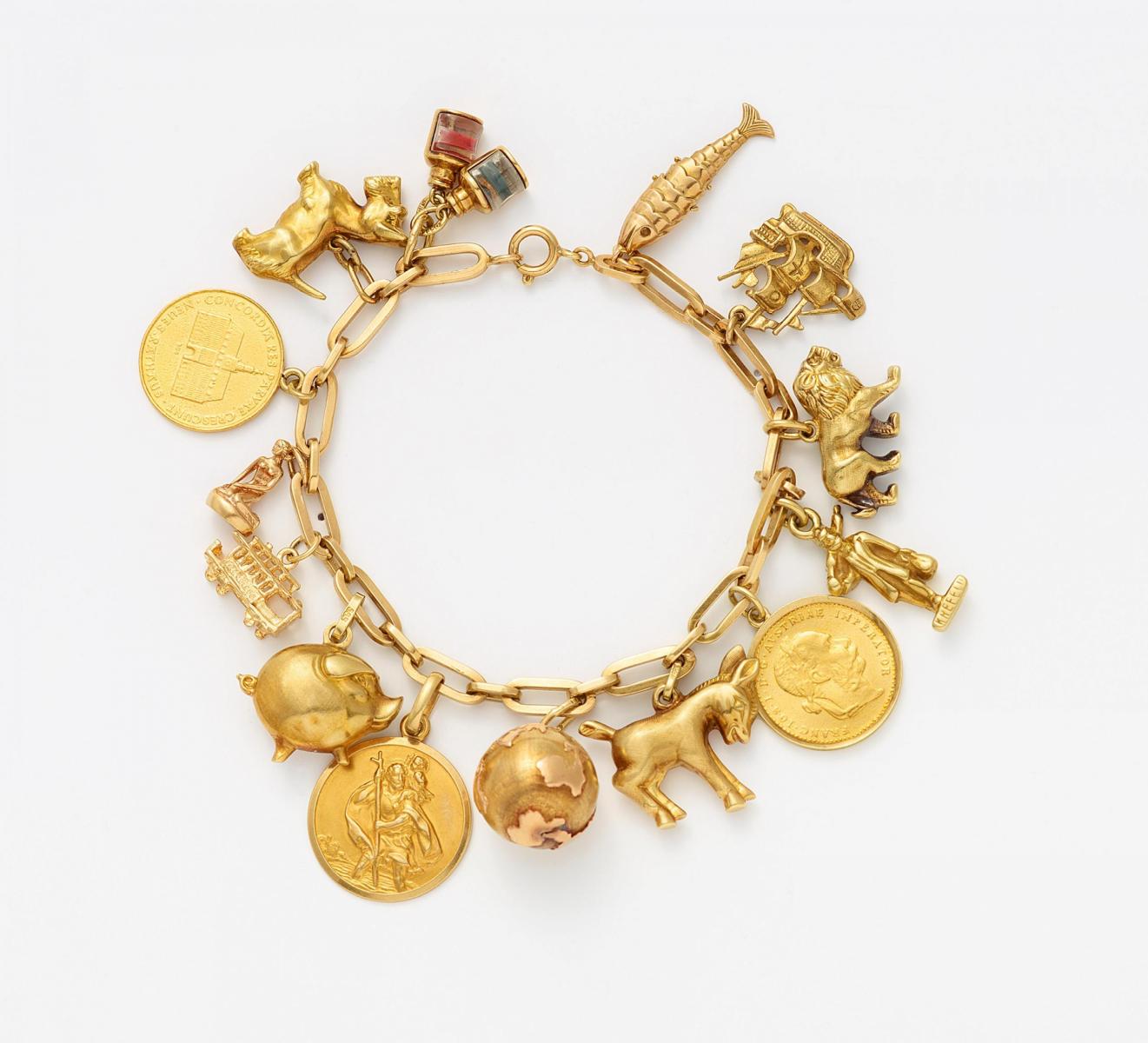 Material: Armband: 585/- Gelbgold, gest.; Anhänger: 333/- und 585/- Gelbgold, gest., teils ungestempelt, Glaseinlage.