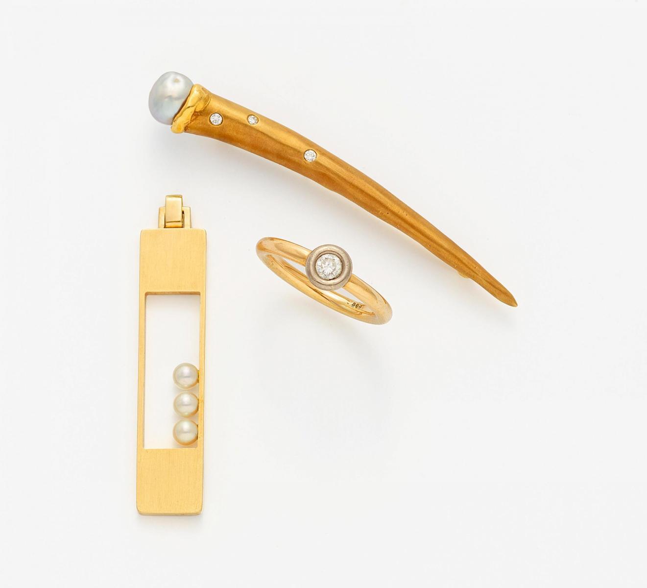 KONVOLUT: PERL-ANHÄNGER, PERL-DIAMANT-STABNADEL UND DIAMANT-RING.