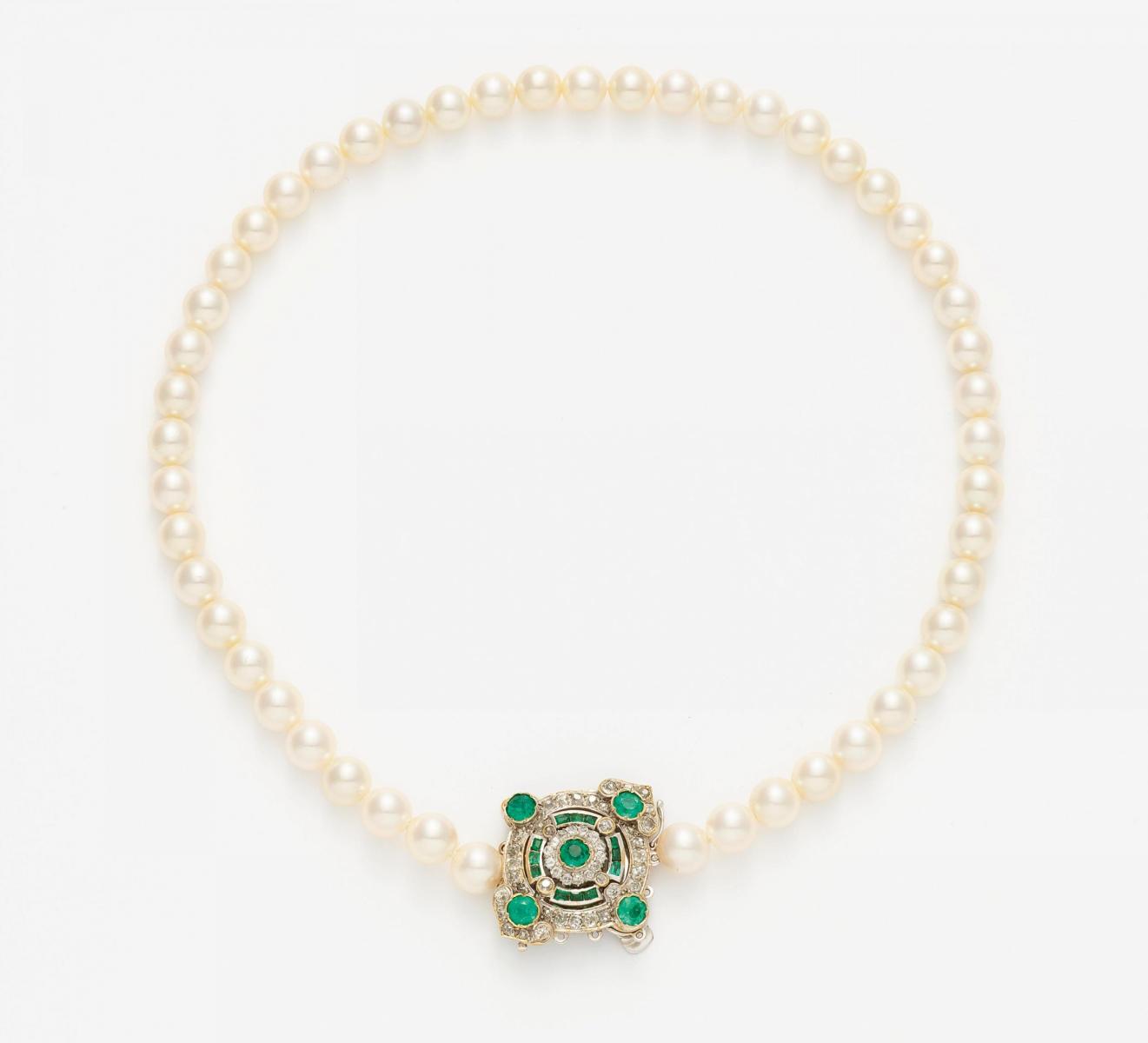 Edelsteine: 5 rund facettierte Smaragde, 12 facettierte Smaragd-Karrees (Tragespuren),.