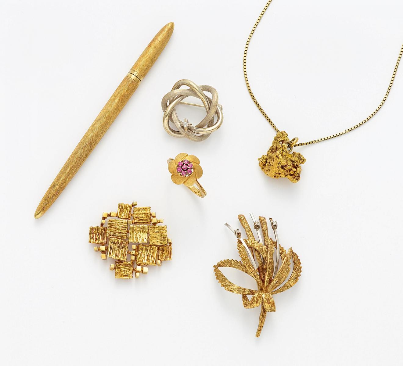 Material: Broschen: 585/- Gelb-/Weißgold, gest.; Ring: 750/- Weiß-/Gelbgold; Kugelschreiber: 585/- Gelbgold, gest., innen aus Metall; Kette: 585/- Gelbgold, gest.; Anhänger: goldfarben, nicht gest..