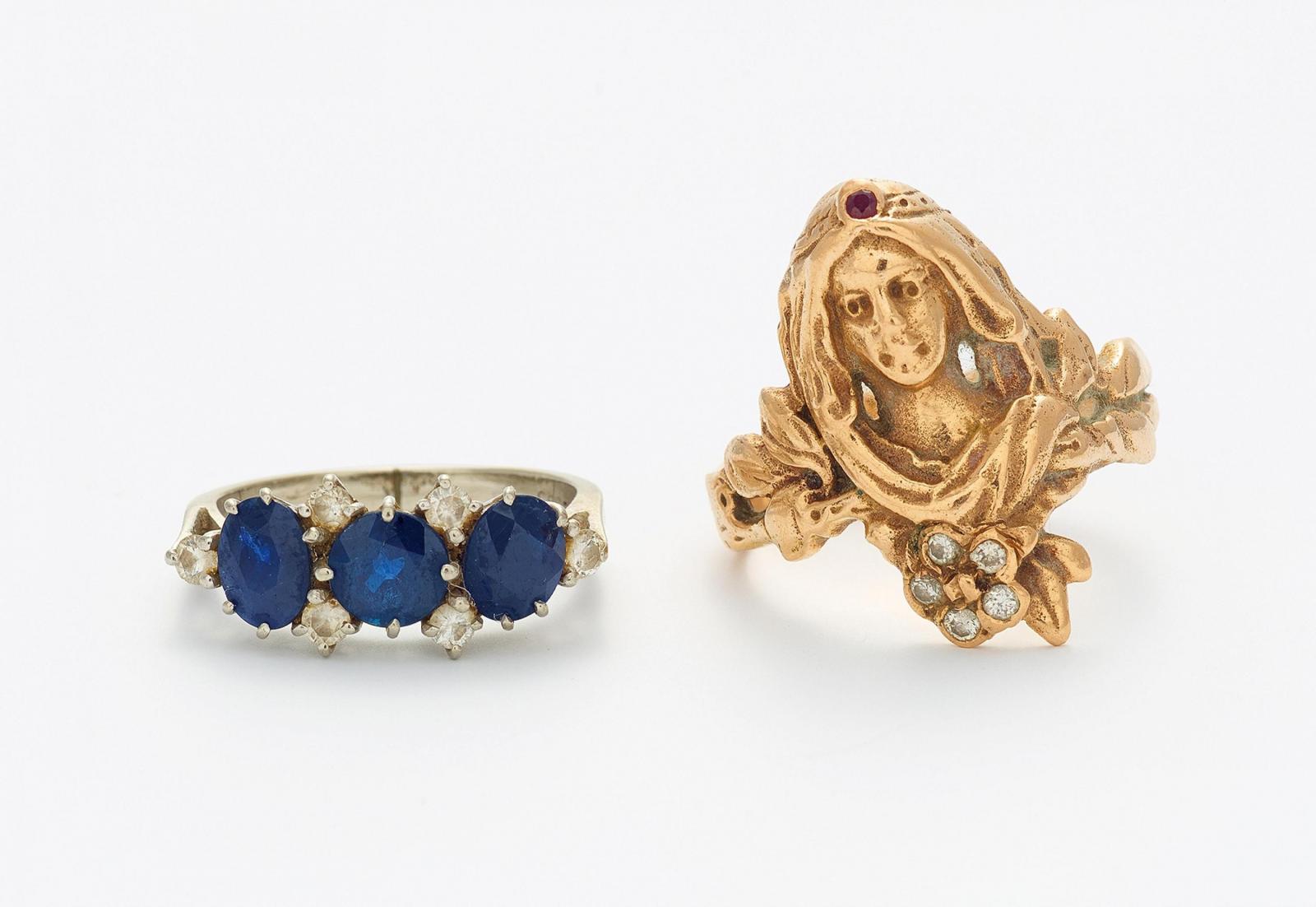 Edelsteine: 3 rund facettierte Saphire, 1 rund facettierter Rubin..