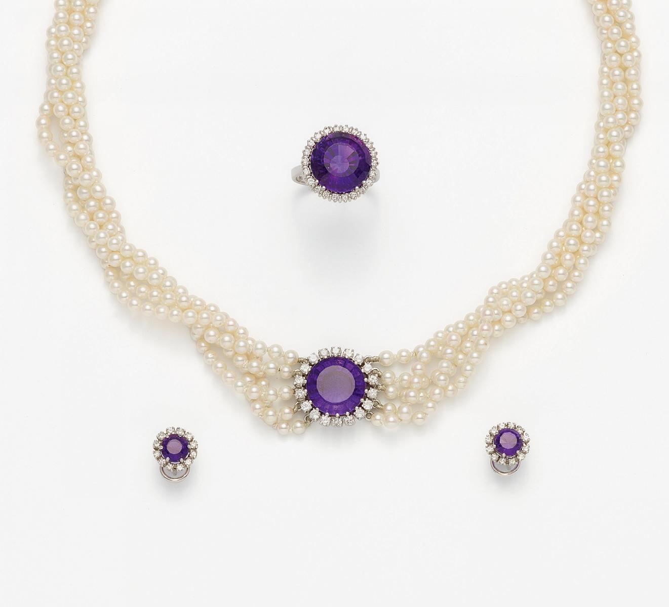 AMETHYST-ZUCHTPERL-SET: COLLIER, RING UND OHRSTECKCLIPS.