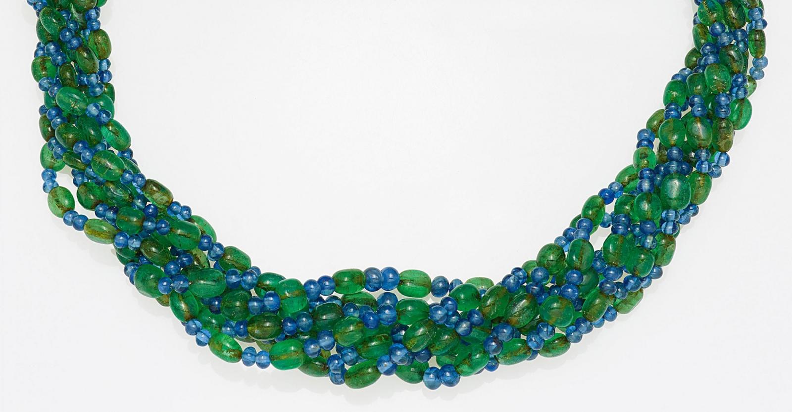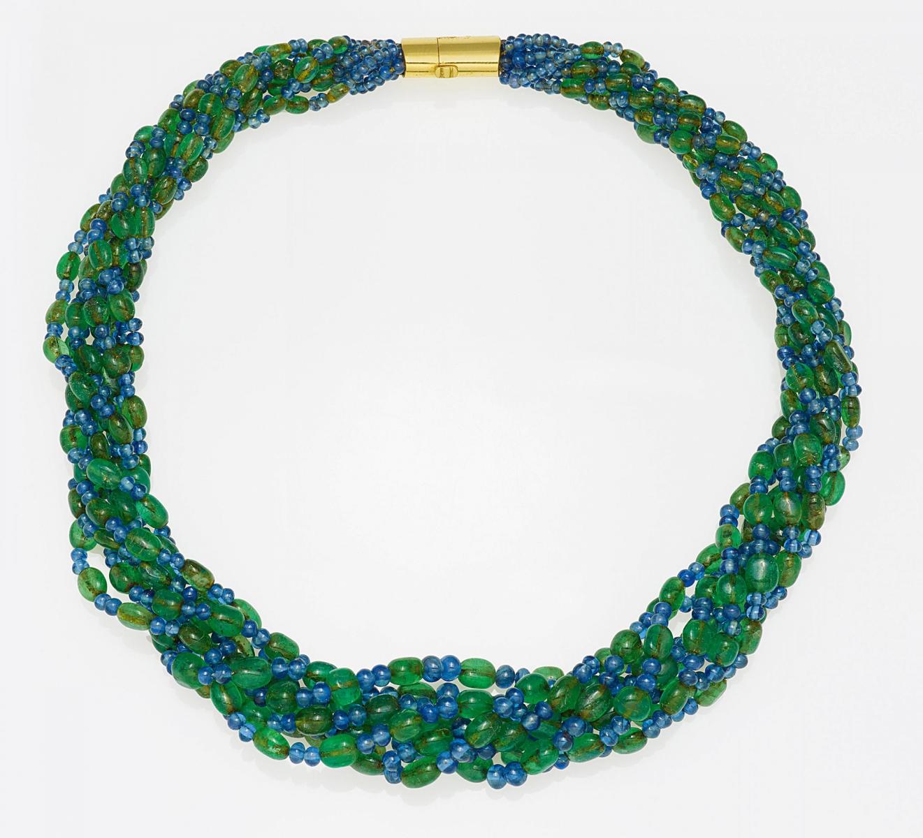 Edelsteine: Vielzählige ovale Smaragd-Cabochons, D.ca. 6,4 x 4,3mm und Saphir-Kugeln, D.ca. 3,0mm zu 8 Strängen..