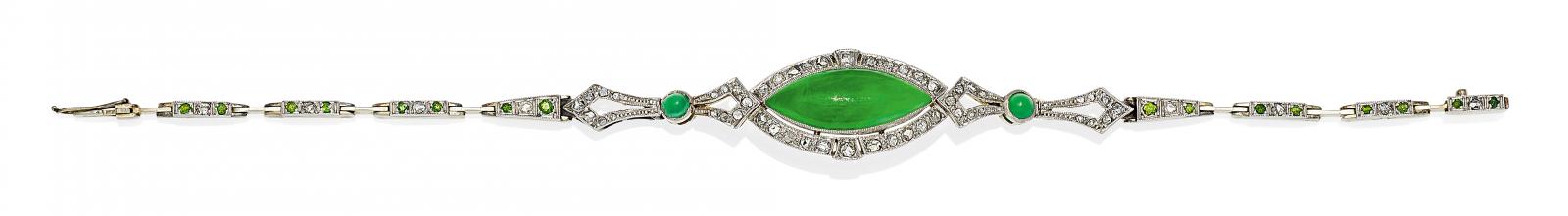 585/- Gelbgold/ Platin, Gesamtgewicht: 11,0g. L.ca. 17,0cm. 60 Diamantrosen zus.ca. 0,2ct, 1 Jadeit-Cabochon im Navette, 2 runde Jadeit-Cabochons, 16 rund facettierte, synthetische Smaragde, teils mit Abplatzungen.