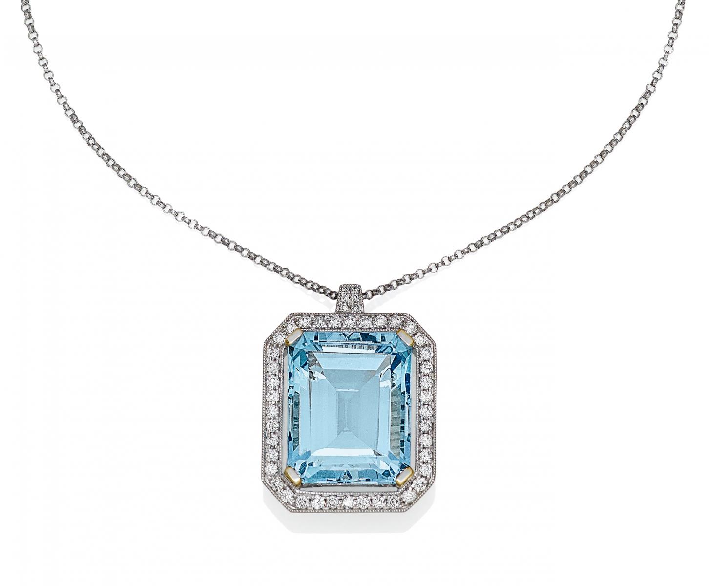 750/- Weiß-/Gelbgold, Gesamtgewicht: 9,2g. L.ca. 44,0cm, Anh. H x B=ca. 2,5 x 1,8cm. 46 Brillanten zus.ca. 0,5ct W(H) SI, 1 facettierter Topas ca. 18,2ct.