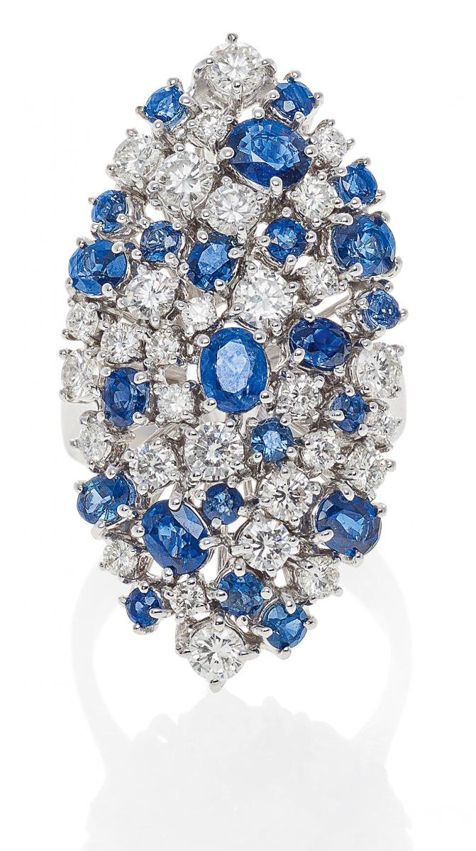 750/- Weißgold, Gesamtgewicht: 14,8g. H x B=ca. 3,6 x 1,8cm. Ca. 30 Brillanten zus.ca. 1,5ct W-CR(H-J) VS1-2, 23 rund/ oval facettierte Saphire D.ca. 1,7mm, D.ca. 4,6 x 3,7mm, behandelt.