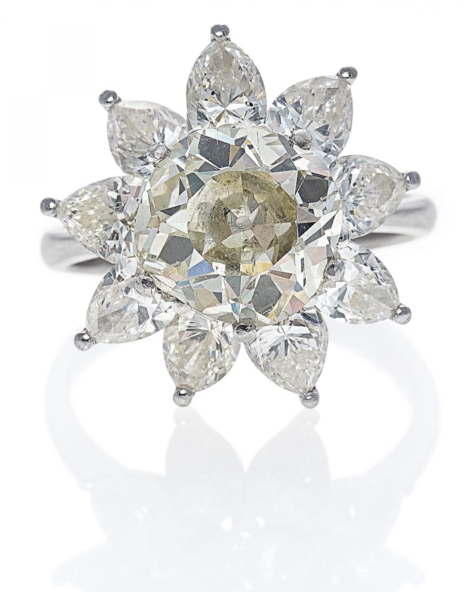 950/- Platin, Gesamtgewicht: 8,4g. EU-RM: 51. 1 Altschliff-Diamant, unrund, ca. 2,6ct Cape(M-O) P1, rissgefüllt. 9 Diamant-Navettes zus.ca. 2,7ct TCR-CR(I-J) SI-P1.