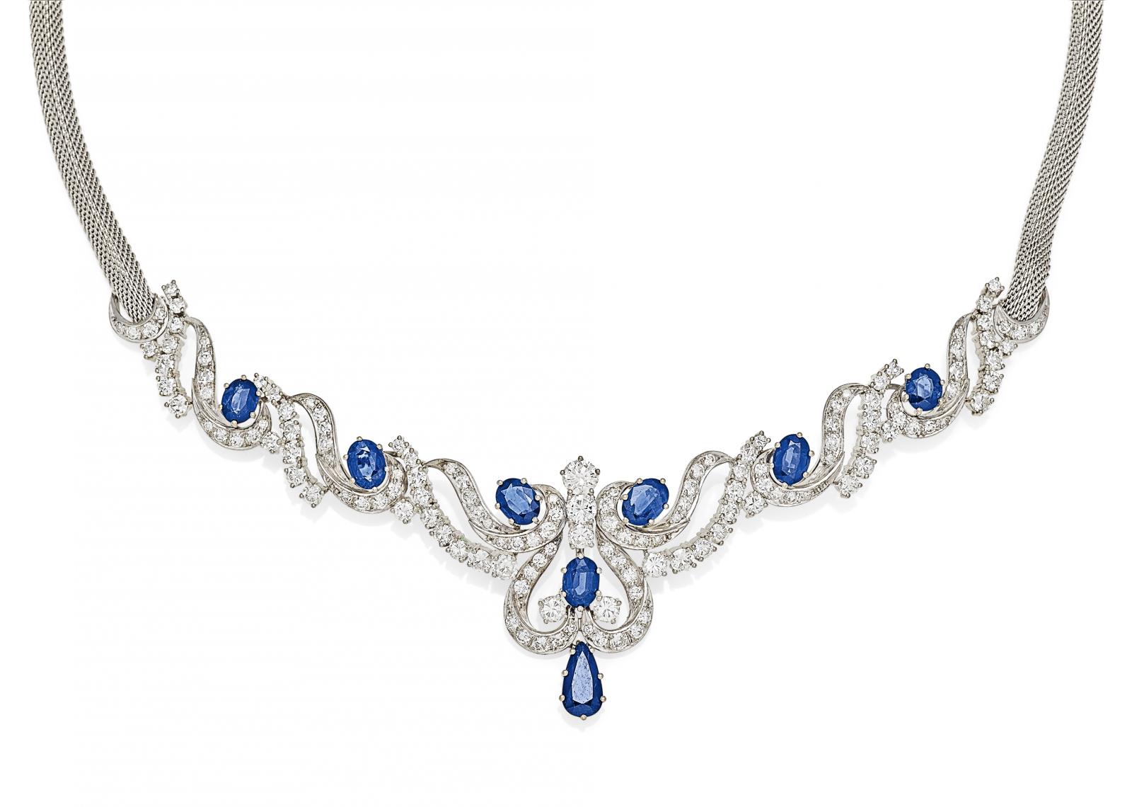 585/- Weißgold, Gesamtgewicht: 30,0g. L.ca. 39,0cm. Ca. 122 Diamanten im 8/8- und Brillantschliff zus.ca. 4,2ct W-TCR(H-I) VVS-VS2, 7 oval facettierte Saphire, 1 facettierter Saphir-Tropfen, teils synthetisch.